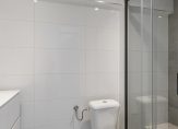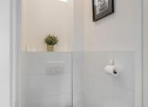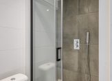 De moderne badkamer is geheel betegeld in grijs/witte betegeling en voorzien van een douchehoek met regen- en handdouche, wastafelmeubel en tweede toilet.