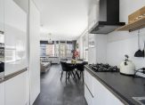 De keuken is aan de voorzijde van het appartement gelegen en beschikt aan een rechte opstelling aan twee zijden. Deze hoogglans witte keuken beschikt over een gaskookplaat met afzuiging, koel-/vriescombinatie, oven en vaatwasser.