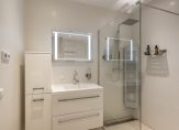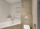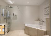 De badkamer is ruim van opzet en heeft een taupe/witte kleurstelling. Er is een inloopdouche aanwezig met sunshower en infrarood, een hoekligbad met jacuzzi, wastafelmeubel met spiegel, een toilet en ingebouwde radio.