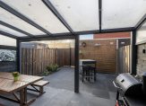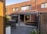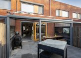 De achtertuin is gelegen op het zuiden en beschikt over een fraaie overkapping met elektrische zonnedoek en screens zodat je al snel heerlijk buiten kunt zitten. Achterin de tuin staat een houten berging en vindt u de achterom.