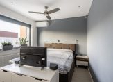 Via de overloop bereiken we de twee royale slaapkamers en de badkamer. Op de overloop licht een mooie lichte houtlook pvc vloer die doorloopt naar beide slaapkamers. Zowel de slaapkamer aan de voor- als aan de achterzijde meten bijna 15 m2. De slaapkamer aan de achterzijde beschikt over een airconditioning en een rolluik. Deze kamer heeft een verlaagd plafond met inbouwspots, omdat er boven deze kamer een grote vliering is gecreëerd te bereiken via de tweede etage.