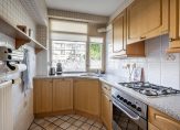 Keurige keuken aan de voorzijde circa 6.5 m² voorzien van 4 pits gas kookplaat met afzuigkap, oven, koel-vriescombinatie, vaatwasser, spoelbak en plavuizen vloer..