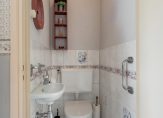 Keurige badkamer circa 2,5 m² voorzien van ruime douchecabine, wastafel met spiegel, radiator en aansluiting wasmachine.