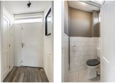 Entree woning, tochthal naar hal met garderoberuimte, een vaste trap naar de slaapverdieping, trapkast en een keurig toilet met raampje, hand wasbakje en gedeeltelijk betegeld.