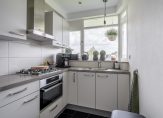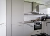 De moderne keukenopstelling van circa 9 m² in lichte kleurstelling is aan de galerijzijde gelegen, vernieuwd in 2020 en is voorzien van een 4-pits gaskookplaat met afzuigkap, oven, koel-vriescombinatie, spoelbak, opstelling cv-combiketel en veel kastenruimte.