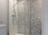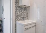 De keurige badkamer is voorzien van een douchecabine, wastafelmeubel met een spiegel, betegeld tot plafond en voorzien van de aansluiting voor de wasmachine.