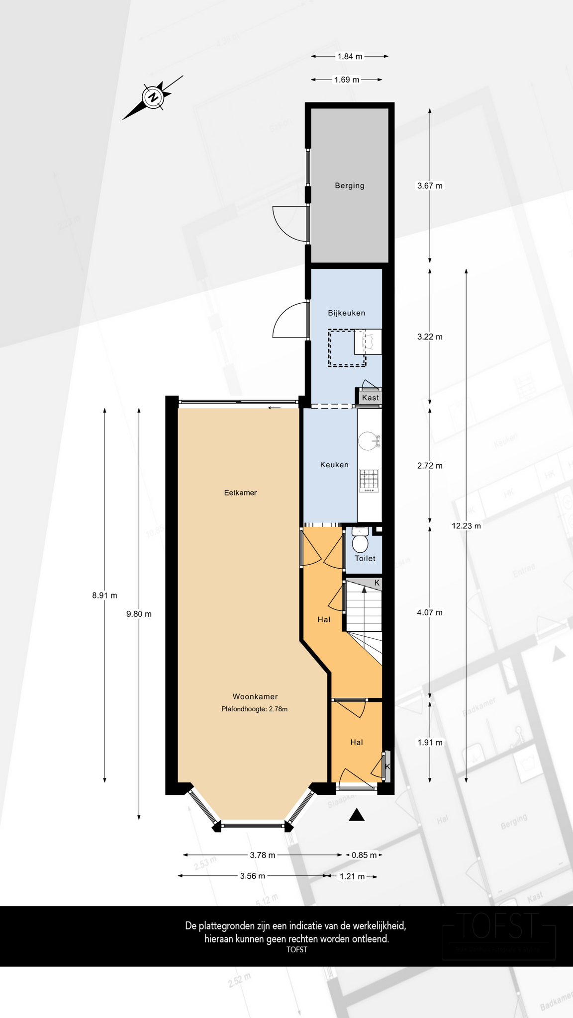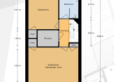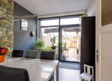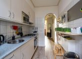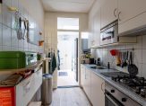 Aan de achterzijde vindt u de complete keuken, circa 6 m², voorzien van alle hedendaagse keukenapparatuur als een 4-pits gas kookplaat met afzuigkap, oven, magnetron, vaatwasser en een geïntegreerde spoelbak. Aansluitend is de bijkeuken met daklicht, loopdeur naar de stadstuin, ruimte voor de koelkast en opstelling wasmachine en wasdroger.