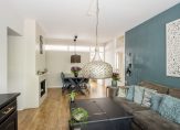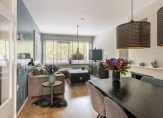 De gezellige en lichte woonkamer biedt voldoende plek voor een fijne zithoek en eetgedeelte en heeft een sfeervolle schouw met bio-ethanol haard.
