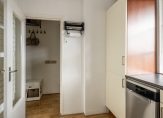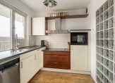 De keuken is gelegen aan de galerijzijde is voorzien van een crèmekleurige keuken in een hoekopstelling en voorzien van een elektrische kookplaat met RVS afzuigkap, combi oven, koelkast, vriezer, klein model vaatwasser en ruime lades.