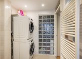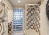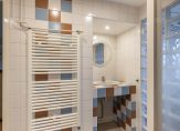 De badkamer in lichte kleurstelling is ruim van opzet en beschikt over een douchehoek met glazen douchewand, wastafel, designradiator, verlaagd plafond met inbouwspots en een wasmachine- en droger aansluiting.