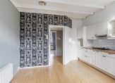 Woonkeuken aan de achterzijde circa 13 m² voorzien van 4 pits gas kookplaat met afzuigschouw, spoelbak, laminaatvloer en toegang tot het zonnige balkon.