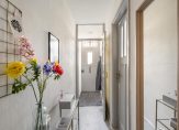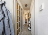 Entree woning, tocht hal voorzien van glas-in-lood tussendeur, garderoberuimte, een vaste kast en toegang tot de woonkamer;