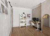 In het midden is de moderne badkamer met zowel een douchecabine voorzien van zwart staal look douchedeur en koof, modern wastafelmeubel met spiegel, hangend toilet en een design radiator. En aan de voorzijde de slaapkamer met vaste kastenwand.