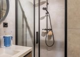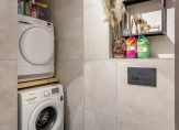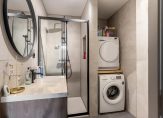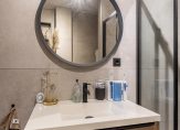 Moderne badkamer voorzien van douchecabine voorzien van stortdouche en zwart staal look douchedeur en ingebouwde koof, een modern wastafelmeubel met ronde spiegel, hangend toilet met soft close zwarte bril, een design radiator, wasmachine- en droger opstelling, afgewerkt met grote wand- en vloertegels en mechanische afzuiging;