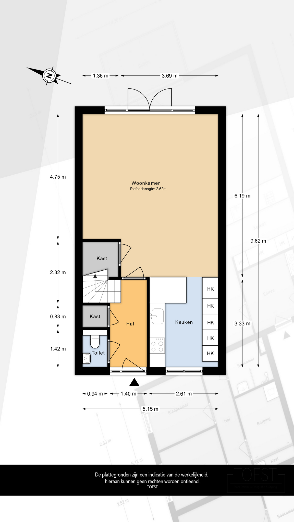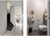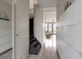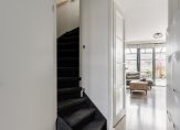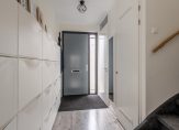 Entree woning, ruime ontvangsthal voorzien van meterkast, garderoberuimte, moderne trap naar de eerste verdieping en een modern toilet met hangend closet, hand wasbakje, betegeld tot het plafond en mechanische afzuiging.