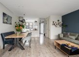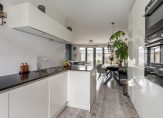 Middels de tussendeur komt u uit in de ruime woonkamer met aan de achterzijde dubbele openslaande deuren naar de achtertuin. Ook de woonkamer heeft dezelfde hout look laminaat vloer met vloerverwarming, welke vloeiend overloopt in de eetkamer en keuken. Aan de voorzijde vindt u de luxe greeploze witte keuken met composiet blad, alle hedendaagse apparatuur zoals inductie kookplaat met afzuigschouw, vaatwasser, spoelbak met Quooker en hoge kastenwand met oven, combi magnetron en koel-vriescombinatie.