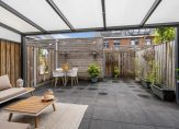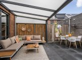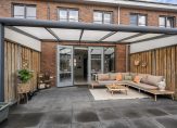 In de onderhoudsarme achtertuin kunt u genieten van het grote terras in de zon of in de schaduw onder de overkapping. De tuin is verder strak afgewerkt met houten erfafscheidingen voorzien van betonnen palen, een achterom en een ruime berging met elektra.