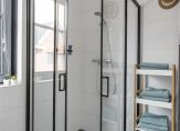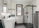 Moderne badkamer circa 5.5 m² voorzien van inloopdouche voorzien van een industriële douchewand met stortdouche en easy drain regengoot. Een wastafelmeubel met dubbele kraan en spiegel. Er is hier ook een 2e toilet met hangend closet, design radiator en betegeld tot het plafond met antraciet/witte betegeling.