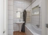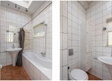 Keurige badkamer circa 4 m² met ligbad voorzien van douchegedeelte, wastafelmeubel met spiegel, design radiator, raam, natuurlijke luchtafzuiging en voorzien van opstelling cv-combiketel.