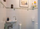 Een keurig toilet met hand wasbakje, betegeld tot het plafond en mechanische afzuiging.