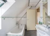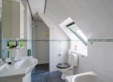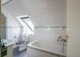 De keurige badkamer is circa 6 m² en uitgevoerd met een inloopdouche, ligbad, tweede toilet, wastafelmeubel, spiegel met kast en Velux dakraam