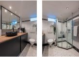Ruime badkamer van circa 5 m² met douchecabine, wastafelmeubel met spiegel, 2e hangend toilet, wasmachine aansluiting, design radiator, raampje en mechanische afzuiging.