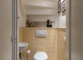 Fraaie toiletruimte met hangend closet en afgewerkt met plavuizen vloer voorzien van hoge plinten, fraaie Oudhollandse wandtegels en een hand wasbakje.