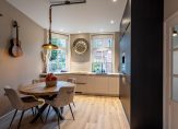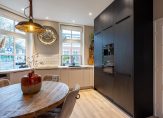 De moderne open keuken met witte fronten en hoge zwarte apparatenwand is gerealiseerd in 2022, voorzien van een gemarmerd blad en alle hedendaagse apparatuur, bevindt deze zich aan de voorzijde van het huis. Door de hoekligging biedt het grote raam een prachtig uitzicht op de omgeving. Aansluitend vindt je de eetkamer, die perfect is voor gezellige diners.