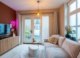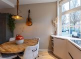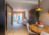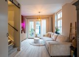 Bij binnenkomst word je verwelkomd in de gezellige woonkamer met zijramen voor een goede lichtinval en sfeervolle roedeverdeling. Deze ruimte, met zijn fraaie afwerking, strakke stucwerk en houtlook pvc vloer met aangename vloerverwarming ademt warmte en karakter. De hippe loft deur verbergt de trap naar de slaapetage. Dankzij de dubbele openslaande deuren stap je zo de zonnige tuin in, waar je kunt genieten van een heerlijk terras en een goede berging.
