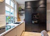 – Moderne witte open keuken met hoge zwarte apparatenwand en alle hedendaagse inbouwapparatuur;