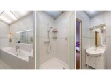 Ruime badkamer van circa 5 m² en voorzien van douchecabine, ligbad met whirlpool, wastafel meubel met spiegel en design radiator.