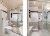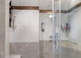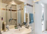 Badkamer circa 5 m² voorzien van inloopdouche met stortdouche en easy drain regengoot, douchecabine, wastafelmeubel met spiegel, tweede toilet, designradiator, betegeld tot het plafond en een natuurlijke luchtafvoer.