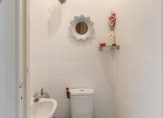 Gang voorzien van toilet met hand wasbakje en mechanische afzuiging, vaste trap naar de eerste verdieping en trapkast.