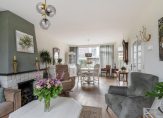 Doorzon woonkamer circa 30 m² voorzien van een parket (frans eiken) vloer, sfeervolle gas open haard en een deur naar de achtertuin.