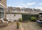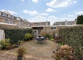 Heerlijk ruime achtertuin van 12 meter, totaal circa 79 m², met meerdere terrassen op het zonnige zuidwesten, groene planten borders en vrijstaande stenen berging van circa 9 m² met overkapping en achterom.