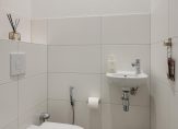 Modern toilet met hangend closet, hand wasbakje gedeeltelijk betegeld.