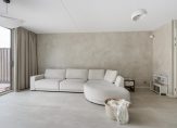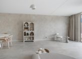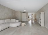 Ruime uitgebouwde en tuingerichte woonkamer voorzien van moderne plavuizen vloer met hoge plinten en vloerverwarming/koeling, Reno vlies behangen wanden, grote trapkast en brede schuifpui naar de achtertuin.