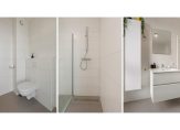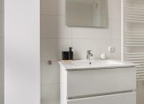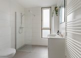 Moderne badkamer circa 5 m² voorzien van inloopdouche met easy drain regengoot, wastafelmeubel met spiegel en hoge kast, tweede hangend toilet, designradiator, betegeld tot het plafond in lichte kleurstelling en mechanische afzuiging;